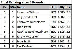 Going into the fifth and final round of the FIDE rated She Plays to Win Invitational tournament at Edinburgh Chess Club on Wednesday, four of the eight players were on 2.5 out of five, making for an interesting pairing. The young women playing were all of a very similar rating and there had been many draws in the earlier rounds.